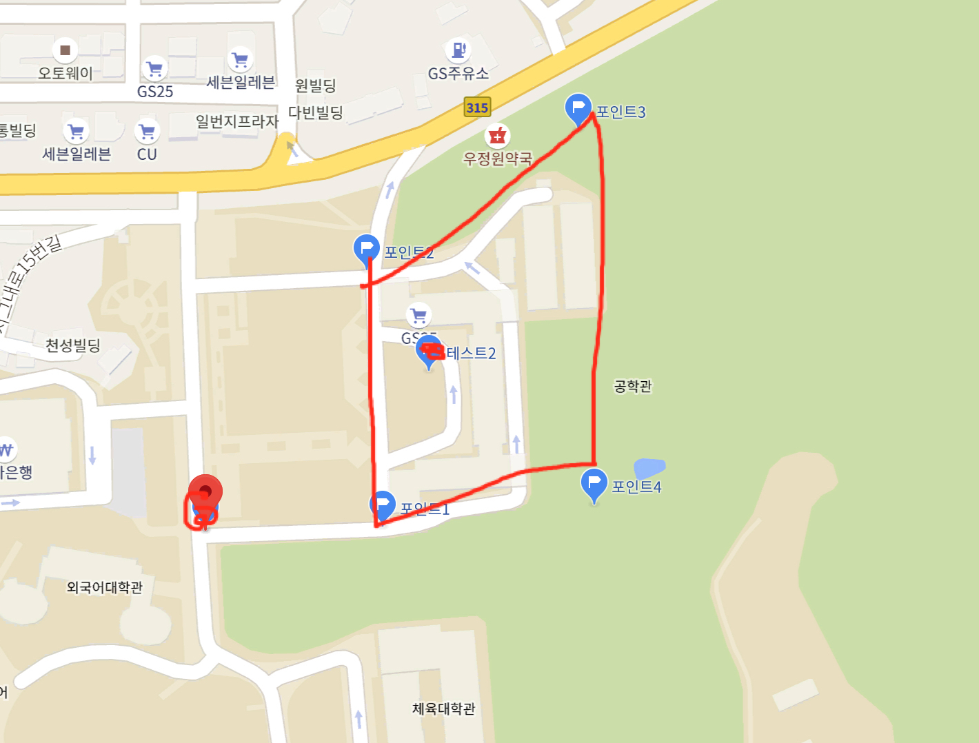 구글 지도를 이용하면 위도 경도를 찾을 수 있음. 적당하게 경희대 공대를 사각형 공간으로 정의 내리고 그 좌표로 폴리곤을 형성. 잘 만들어졌는지 확인하기 위한 좌표는 빨간색으로 색칠한 좌표와 같음. 테스트 1, 테스트 2