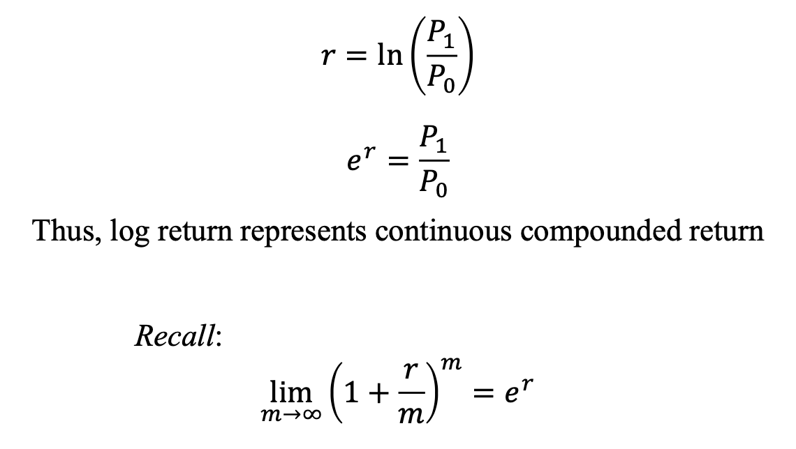 - investment의 performance를 이야기할 때는 log return을 사용하곤 한다.
