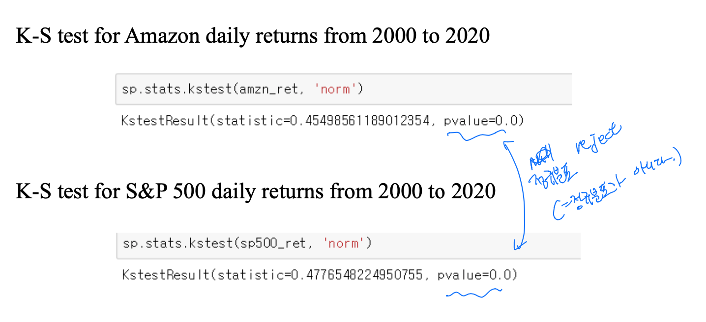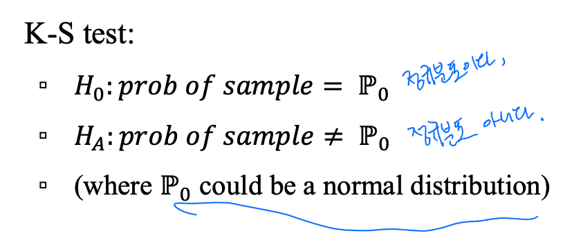 - QQ plot, K-S test, J-B test(sample size가 커야한다)