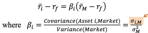 요약하면, CAPM은 자산의 예상 초과 수익률은 시장 포트폴리오의 예상 초과 수익률에 비례하며, 비례 계수는 𝛽입니다. - CAPM은 또한 자산의 예상 초과 수익이 시장과의 공분산에 정비례한다고 말합니다.(𝛽의 수식을 생각하면 okay)