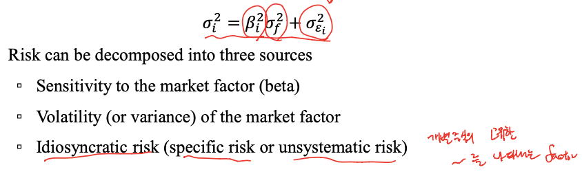 - 에러의 분산 => factor로 표현할 수 없는 risk // 시장의 전체 흐름으로는 설명할 수는 없고, 개별 주식의 고유한 움직인, 특징을 나타내는 risk